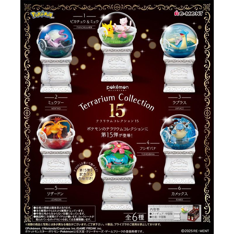 La Colección de Terrarios Pokémon 15 de Re-Ment continúa la apreciada serie de dioramas en miniatura, cada uno con un Pokémon en un entorno único dentro de una esfera de acrÃlico transparente. Este set incluye seis figuras meticulosamente elaboradas, cada una de aproximadamente 6 cm de diámetro, que representan Pokémon en diversos entornos naturales. Ideales tanto para coleccionistas como para fans, estos terrarios ofrecen una encantadora mirada al mundo Pokémon, perfectos para exhibir o como un regalo especial.